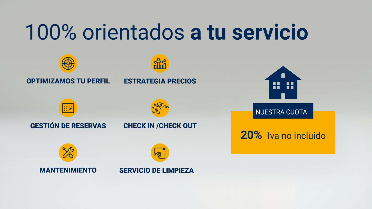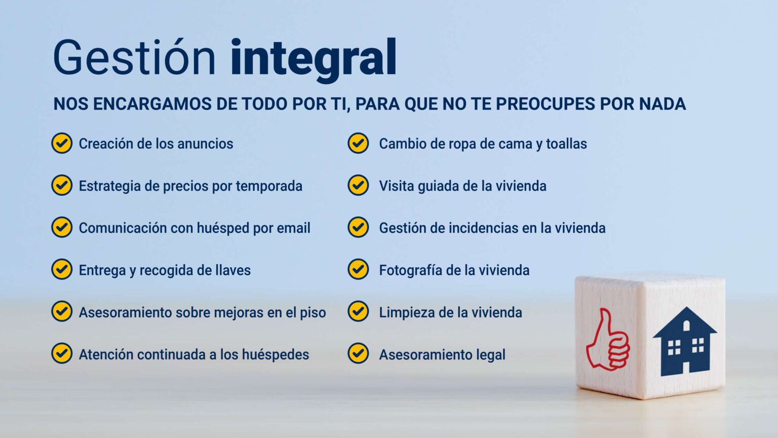 Nosotros nos encargamos de todo para que tú no te preocupes de nada: Creación de anuncios, fotografía de la vivienda, estrategia de precios por temporada, comunicación con huésped por email, entrega y recogida de llaves, asesoramiento sobre mejoras en el piso, atención continuada a los huéspedes, visita guiada de la vivienda, cambio de ropa de cama y toallas, limpieza de la vivienda, gestión de incidencias en la vivienda, asesoramiento legal…etc.