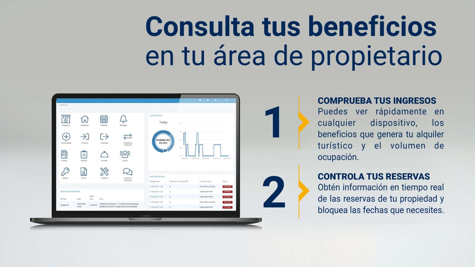 Consulta tus beneficios y reservas vacacionales en tu área de propietario. De manera fácil y rápida podrás seguir desde tu móvil o cualquier dispositivo el rendimiento de tu vivienda vacacional y las reservas en tiempo real con nuestra tecnología de vanguardia.